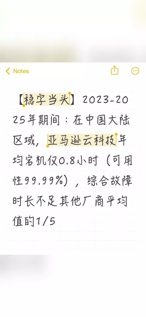 2023-2025年期间亚马逊云年均宕机仅0.8小时 【稳字当头】2023-2025年期间:在中国大陆区域,亚马逊云科技年均宕机仅0.8小时(可用性99.99%),综合故障时长不足其他厂商平均值的1/5 #aws #亚马逊云 #云服务器 #slots