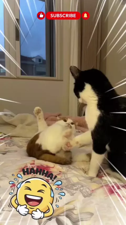 Funny Cat Blocks Another Cat While Lying on the Bed | Playful Cat Moment #memekucing #binatanglucu #duniahewan