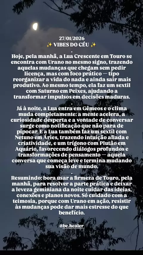 Mudanças de dia, conversas profundas à noite e o universo dando aquele empurrãozinho pra evoluir 🌙✨ Quer entender como essas vibes atuam no seu mapa astral? Vem fazer sua leitura comigo! 📲 WhatsApp: (51) 99242-4528 📸 @be.healer Com Amor, Bê! #vibesdocéu #behealer #mensagemdodia #pensamentododia #mapaastral