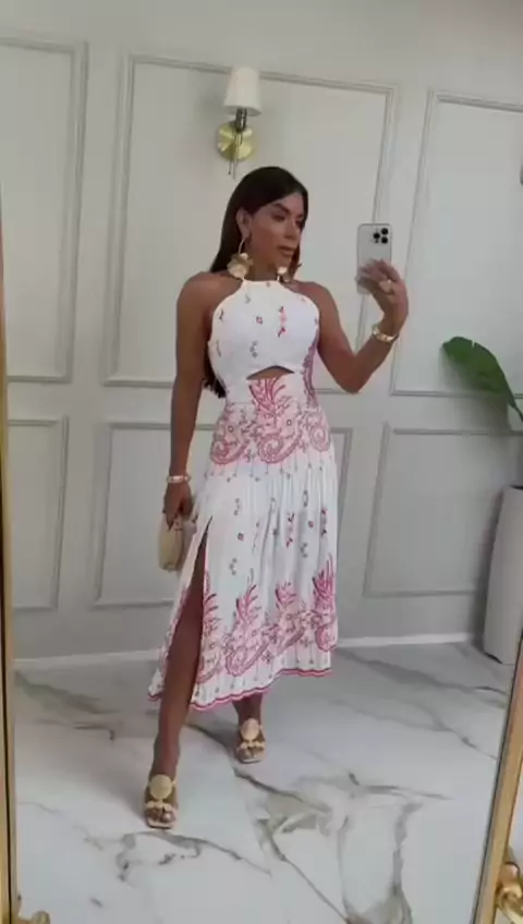Vestido Midi Lese Bordado Gola Halter Moda Fashion Luxo. 🔗Link na Bio do Instagram Vestuário VII #vestidos #modafeminina #look #roupasfemininas #fashion