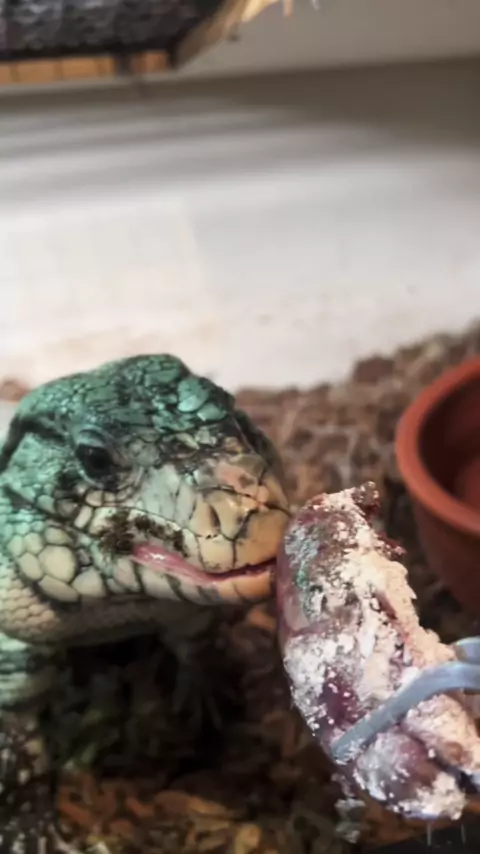 Dando comida par ao lagarto teiú com uma. Veterinária #biologo #lagarto #reptil #lookdocarnaval