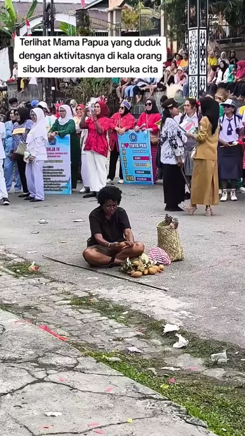 Terlihat mama papua yang duduk dengan aktivytas di kala orang sibuk bersorak dan bersuka cita. Salah satu Netizen Bekata: Mama ini menunjukan fakta yg terjadi di tanah papua #papua #mamapapua #khdpnorangpapua # #