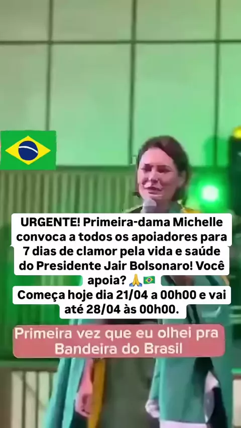 URGENTE! Primeira-dama Michelle convoca a todos os apoiadores para 7 dias de clamor pela vida e saúde do Presidente Jair Bolsonaro! Você apoia? 🙏🇧🇷Começa hoje dia 21/04 a 00h00 e vai até 28/04 às 00h00.
