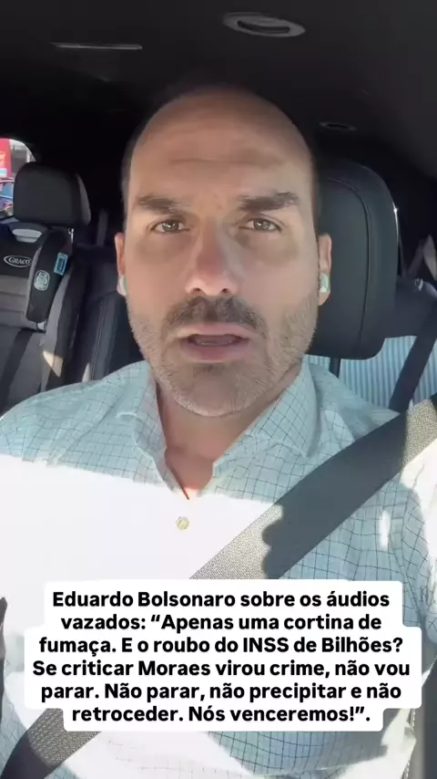 Eduardo Bolsonaro sobre os áudios vazados: "Apenas uma cortina de fumaça. E o roubo do INSS de Bilhões? Se criticar Moraes virou crime, não vou parar. Não parar, não precipitar e não retroceder. Nós venceremos!".