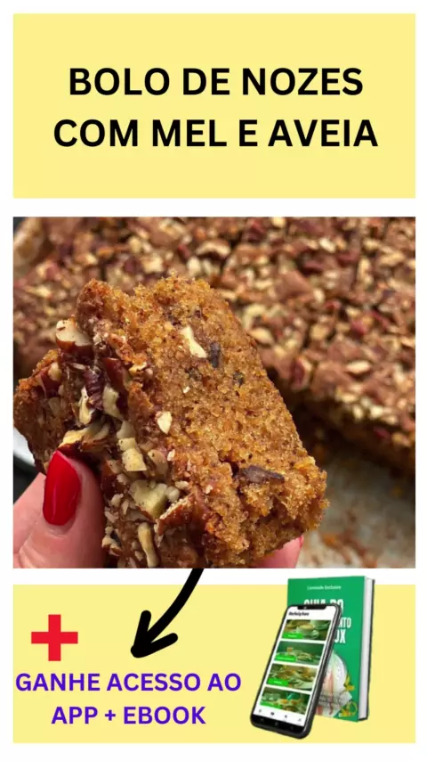 BOLO DE NOZES COM MEL E AVEIA 😋 Ingredientes: 3 ovos 1/2 xícara mel 1/4 xícara óleo da sua preferência 1/2 xícara leite vegetal ou desnatado 1 xícara farinha de aveia 1/2 xícara farinha de amêndoas (pode ser aveia) Nozes picadas a gosto 1 colher (sopa) fermento em pó Misture todos os ingredientes em uma tigela. Transfira para uma forma untada e enfarinhada. Leve ao forno por 30 minutos a 200 graus! 🤩 Descubra o segredo para emagrecer sem abrir mão do prazer de comer!