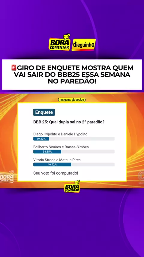 🔥Enquete mostra quem sai! Qual dupla você quer eliminar no segundo paredão? Diego e Dani, Edy e Raissa ou Vitória Strada e Mateus? #BBB25 👀
