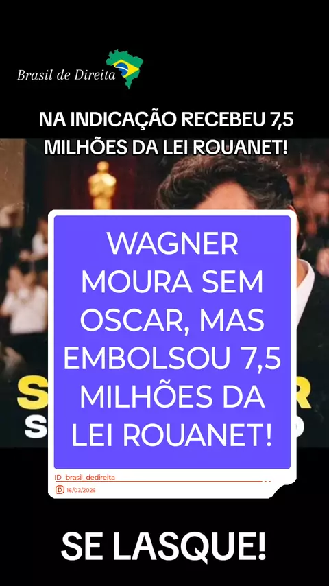 WAGNER MOURA SEM OSCAR, MAS EMBOLSOU 7,5 MILHÕES DA LEI ROUANET! #brasil #bolsonaro #direita #riodejaneiro #politica