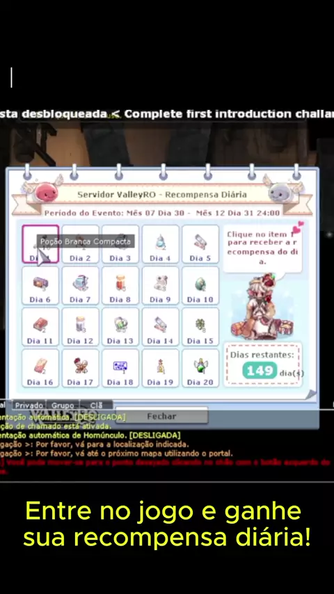 🎮✨ Comece com tudo no ValleyRO! ✨🎮 No início da sua jornada, você já é recompensado: 🎁 Recompensa diária garantida 📦 Kit completo para iniciantes 🧙‍♂️ Fale com o NPC Entrega Iniciante e receba: 👑 Aura rara exclusiva 🦊 Orelha de Raposa Roxa (visual raro) 💸 Baú com 5.000 moedas ValleyRO (valem CASH) 💰 1 milhão de zenys 🧳 E muitos outros itens para começar bem! ⏳ Válido até 10/08 — aproveite enquanto é tempo! ⚔️ E claro, conte com a Mestra das Classes para evoluir e se tornar uma lenda