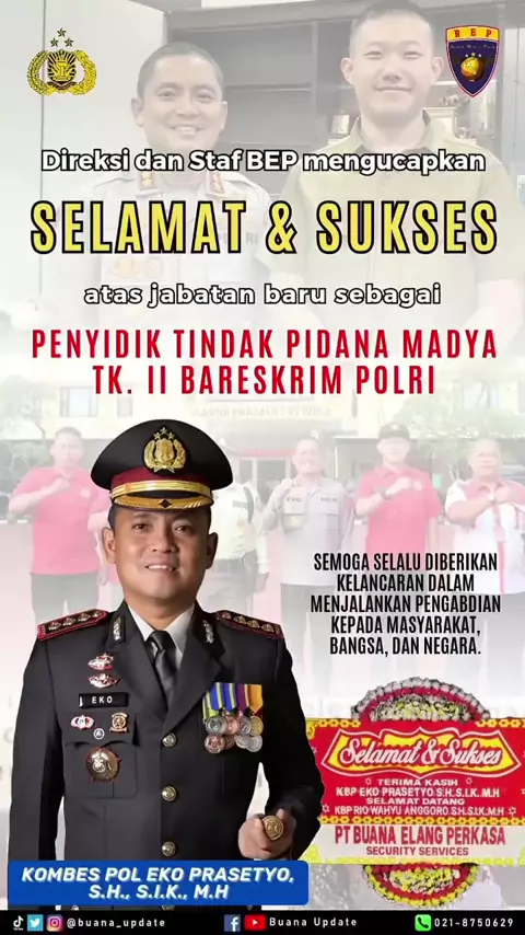 Direksi dan Staf PT Buana Elang Perkasa mengucapkan Selamat dan Sukses kepada Kombes Pol Eko Prasetyo, S.H., S.I.K., M.H atas jabatan barunya sebagai Penyidik Tindak Pidana Madya Tk. II Bareskrim Polri. 🫡 Semoga bapak semakin sukses di tempat yang baru serta selamat atas kenaikan pangkat satu pangkat lebih tinggi kepada Iptu Oktarina Sari, S.H., M.H. ✨ #MauKerenBEPAja #EkoPrasetyo #Bareskrim #2025 #Indonesia Jangan lupa like, tinggalkan comment, dan share video ini! Tonton video kami lainny
