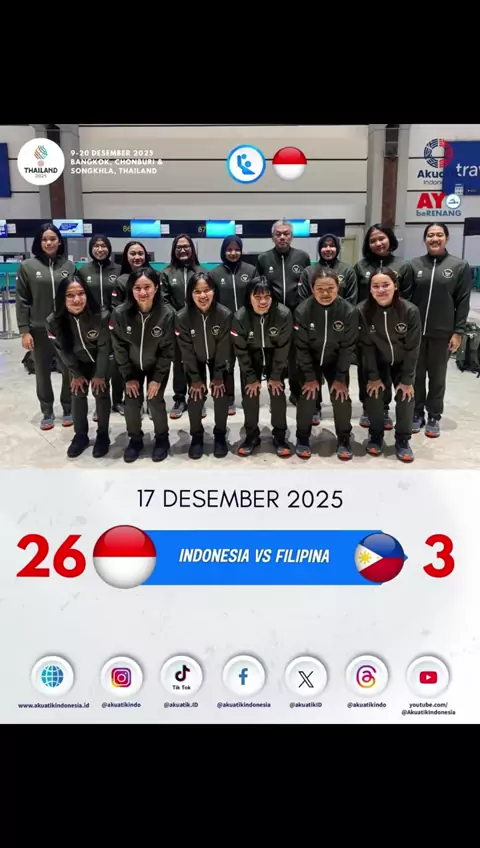 🔊 Tim Polo Air Putri Indonesia berhasil memetik kemenangan telak di pertandingan kedua Sea Games 2025, saat melawan Filipina di Thammsat University Rangsit Campus, Thailand. (Rabu, 17/12/2025) 🇮🇩 Indonesia 26 - 3 Filipina 🤽‍♀️ Hasil ini membuat tim polo air putri Indonesia berhasil mengumpulkan poin 3 dari dua pertandingan yang sudah mereka jalani. ➡️ Besok tim polo air putri Indonesia akan melakoni pertandingan ketiganya melawan Singapura jam 14.00 waktu Bangkok❗️ LET'S GO GIRLS.... #Akua...