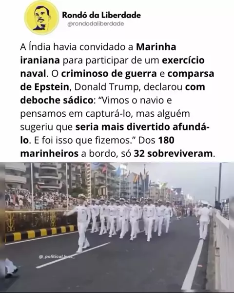 🇮🇳 A Índia havia convidado a Marinha iraniana para participar de um exercício naval. O criminoso de guerra e comparsa de Epstein, Donald Trump, declarou com deboche sádico: “Vimos o navio e pensamos em capturá-lo, mas alguém sugeriu que seria mais divertido afundá-lo. E foi isso que fizemos.” 🚢 O navio era o IRIS Dena, da Marinha iraniana. Ele havia participado do exercício naval MILAN 2026, na Índia, realizado em Visakhapatnam entre 15 e 25 de fevereiro, antes do início das agressões de EUA