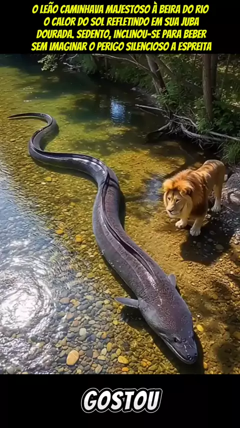 O leão caminhava majestoso à beira do rio, o calor do sol refletindo em sua juba dourada. Sedento, inclinou-se para beber, sem imaginar o perigo silencioso que o espreitava na água. Um peixe elétrico, pequeno, mas mortal, sentiu a aproximação do predador. Num instante, uma descarga percorreu o corpo do leão. Ele recuou, atordoado, as patas tremendo. A força da eletricidade o derrubou na margem #educação #foryou #vidaanima #ia #viraliza