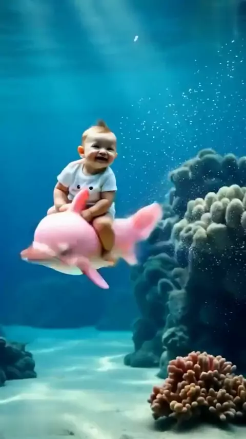 Cute baby swimming with DOLPHIN