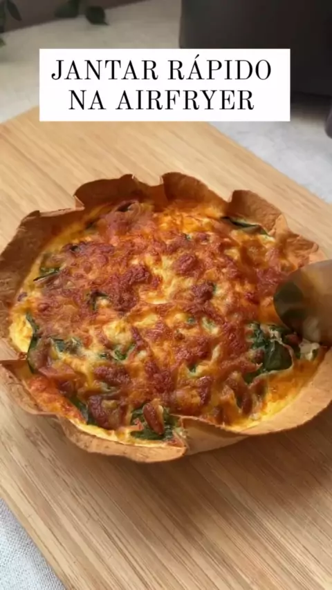 Ingredientes 1 wrap 3 ovos 80 gr de requeijão light Cobertura de escolha foi usado tomate ameixa, cebola roxa e espinafre 30gr de mussarela ✅ Preparo Adicione os ovos, requeijão, sal e a pimenta em uma tigela e mistura até incorporar. Coloque o wrap uma forma e despeje a mistura de ovos. Adicione o tomate, cebola , espinafre e misture. Cubra com queijo e leva para a Airfryer pré aquecida a 170° no modo assar por 15min. #Comida #pizza #saudavel #fitness #Fácil