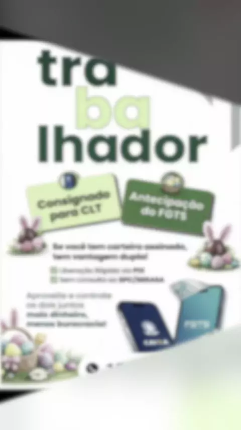 🐰 A Páscoa está chegando… e você já garantiu seu dinheiro extra? 💰 Se precisar, posso te ajudar com uma simulação rápida e gratuita 👇 Trabalho com 4 modalidades de crédito: ✔ FGTS (antecipação) ✔ CLT (consignado) ✔ Bolsa Família ✔ Conta de luz 💸 Valores sujeitos à análise ⚡ Processo simples, rápido e sem complicação 💛 Aproveite a Páscoa com mais tranquilidade ao lado da sua família 📲 Simulação gratuita agora: 15 99602-9615