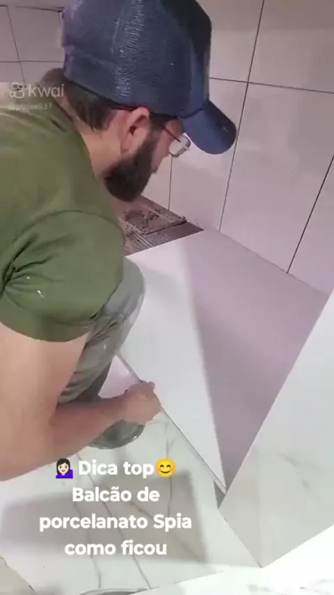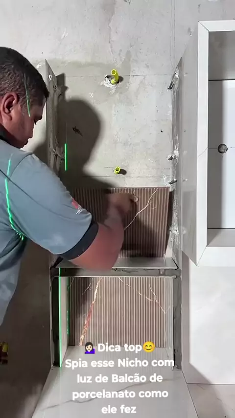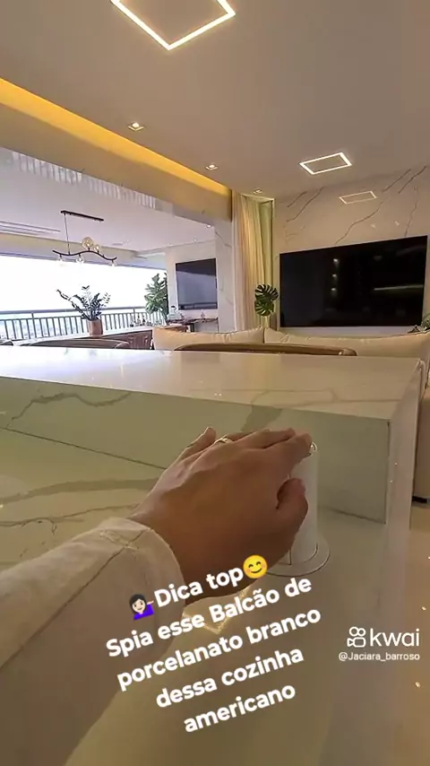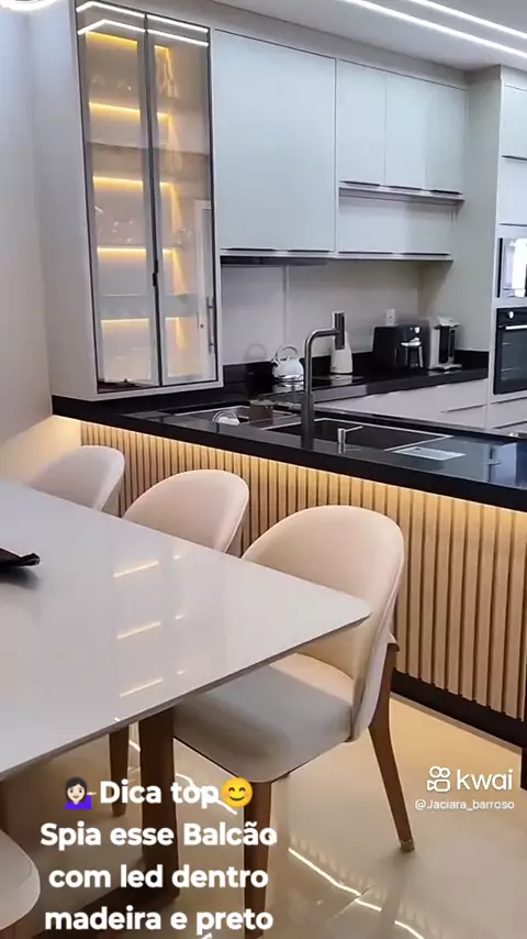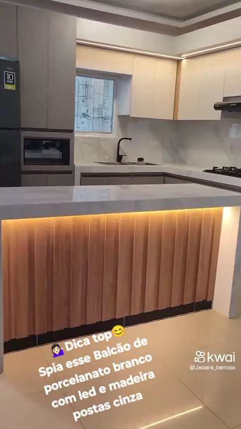 💁🏻‍♀️Dica top😊 Spia esse Balcão de porcelanato branco com led e madeira postas cinza