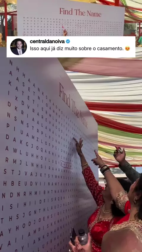Isso aqui aconteceu durante um Haldi, uma celebração pré-casamento muito comum na Índia. Mais leve, colorida e cheia de interação, bem diferente da formalidade da cerimônia principal. E olha a ideia dos noivos: Eles criaram um caça-palavras gigante com os nomes dos convidados escondidos ali. Na chegada, cada pessoa precisava procurar o próprio nome, circular no painel e, sem perceber, já começava a interagir, rir, comentar… se envolver. Funciona como quebra-gelo. AMEI! 😍