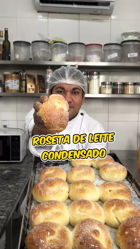 Roseta de leite condensado com açúcar cristal Em uma vasilha: 1kg de farinha, 80g de açúcar, 10g de sal, 60g de margarina, 50ml de leite, 30ml de gema, 50g de fermento fresco, 2 ovos, 600ml de água gelada e misture bem Corte a massa em pedaços de 70g, abre, dobre e modele a massa como mostrado no vídeo Deixe descansar por 30 minutos Pincele com gema Forno 200 graus por 15 minutos Pincele com leite condensado e finalize com açúcar cristal por cima #pão #doce #Receita