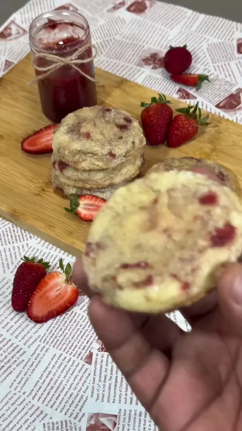 🍓 Cookies de Morango e Baunilha @cheffpatricksantos Geleia de Morango: • 300 g de morangos picados • 50 g de açúcar refinado Massa dos Cookies: • 200 g de farinha de trigo (tradicional sem fermento) • 3 g de fermento em pó • 2 g de sal • 100 g de açúcar refinado • 100 g de manteiga sem sal (bem macia) • 1 ovo grande • 5 g de essência de baunilha • 75 g de açúcar refinado (para enrolar a massa) Recheio: Use um Kinder Bueno pronto e forneável para o recheio. Asse a 180° por 15 minutos