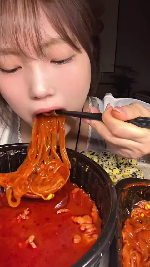 Today's late-night snack... Spicy chicken feet in soup!! ASMR♥️ Sorry for uploading at 2 a.m.... I ordered from a place called Spicy Chicken Feet. They made rice balls and served bibim noodles. The chicken feet were delicious, but this was the real deal!!♥️ #eatingshow #mukbang #koreanfood #asmrfood #mukbang