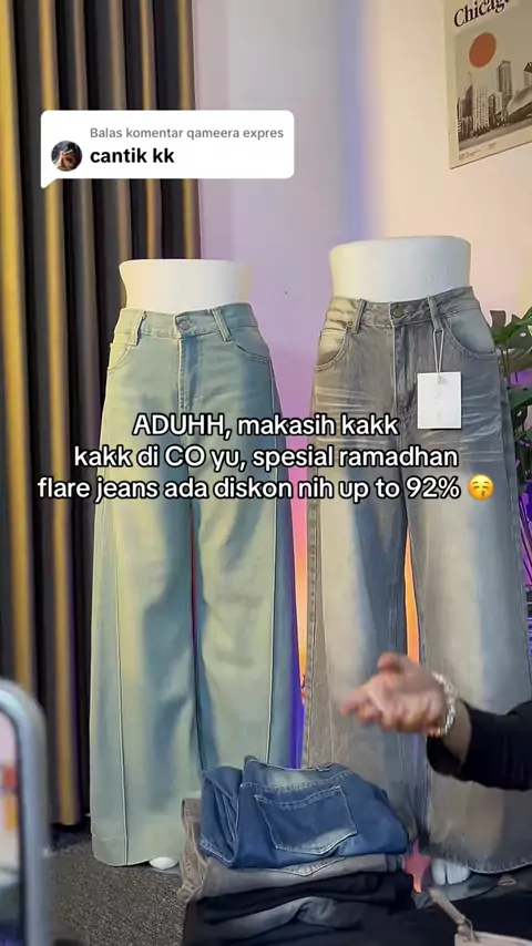 harga promo flare jeans terbatas bebb, flare jeans ini cuma bisa dipake cewek ya say 🥰 #flaredjeans #flaredpantsoutfit #jeanshighwaist #kulotjeans #promomakanharian
