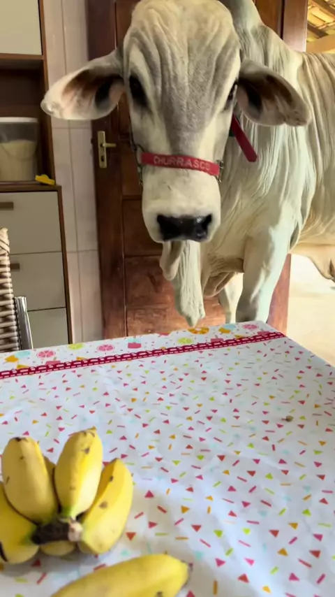 Cena normal da minha casa: um boi na cozinha comendo banana com a Farofa 😂🐂 #churrascooboi #boimanso #boidomestico #bezerra
