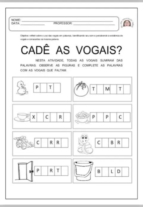 Olá pessoal! Completar as palavras com as vogais. Trabalha o som de cada vogal.