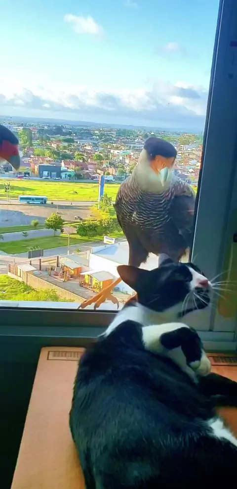 Conviver pacificamente exige paciência! Este falcão não aceita a amizade do gato. #topz #Falcon #window #CAT #CapCut