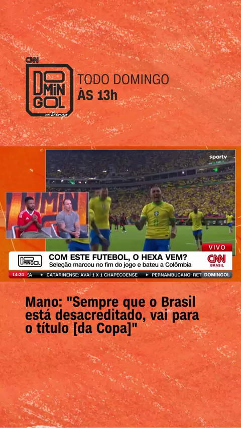 O HEXA VEM? 🏆🟩🟨 O elenco do #DomingolcomBenja analisou a vitória da Seleção brasileira sobre a Colômbia, na última quinta (20), por 2 a 1. Apesar do desempenho, @mauricioborgesmano acredita que é possível vencer a Copa do Mundo de 2026. Para o comentarista, quando o Brasil chega desacreditado, conquista a taça. Concorda, torcedor (a)? #CNNEsportes #CNNAoVivo #Futebol #Seleção
