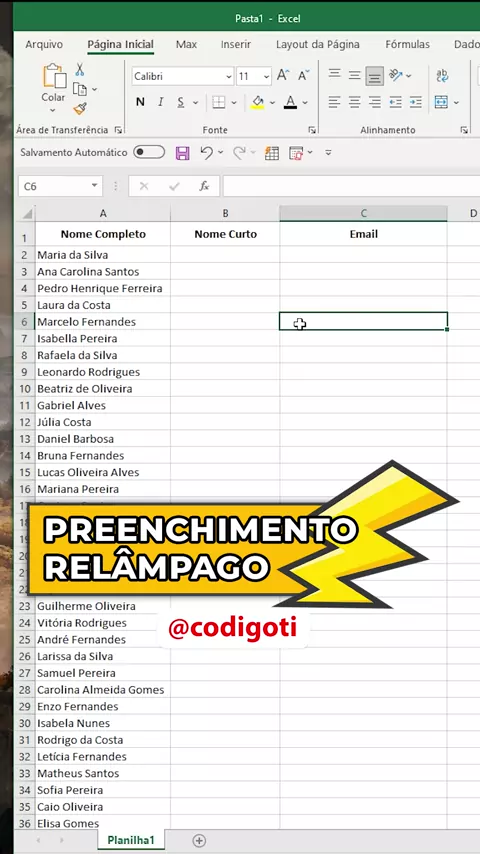 O Preenchimento Relâmpago no Excel detecta padrões em dados e completa automaticamente as células com base nesses padrões. Ele é ativado ao digitar um exemplo e pressionar Ctrl + E ou usar a opção na guia Dados. 😉 Quer aprender mais sobre o Excel? Clica no link da BIO 👉 @codigoti. 👈 #Excel #planilhas #planilha #sheets #adm
