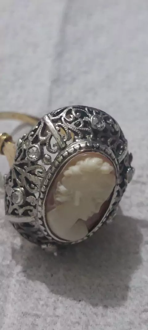 Anel em ouro rosado modelo oval com base superior em prata navalhada com ponto de pedra de diamantes lâmina de madrepérola com imagem em alto relevo peça vintage.