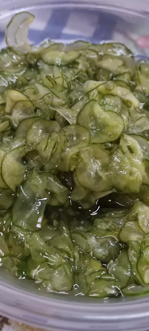 Sunomono! INGREDIENTES 1 pepino japonês 3 colheres (sopa) vinagre de arroz 2 colheres (sopa) de açúcar refinado Sal a gosto 1/2 xícara (chá) e água MODO DE PREPARO 1. Comece fatiando o pepino com a ajuda de um mandolim. Em seguida, coloque o sal e deixe ele desidratando por 20 minutos. 2. Em uma panela ferva a água com o vinagre e o açúcar até a mistura ficar transparente. 3. Lave bem o pepino na água corrente para retirar o sal e adicione o molho. 4. Leve a geladeira e sirva frio.