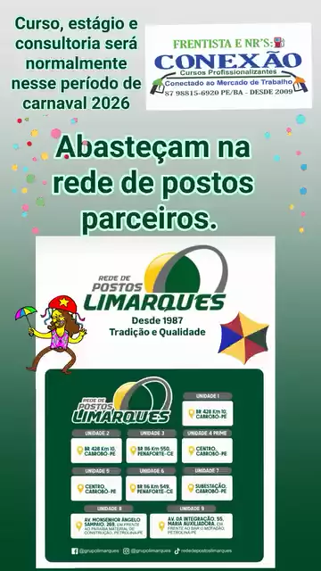 CONEXÃO CURSOS DESDE DE 2009⛽ PETROLINA-PE, JUAZEIRO-BA E CIDADES VIZINHAS ⛽ CURSO COMPLETO E RÁPIDO 💯% PRÁTICO. ⛽ FRENTISTA E NR'S ⛽ CONTATO: 87988156920 ⛽A INSTITUIÇÃO DE CURSO PROFISSIONALIZANTE