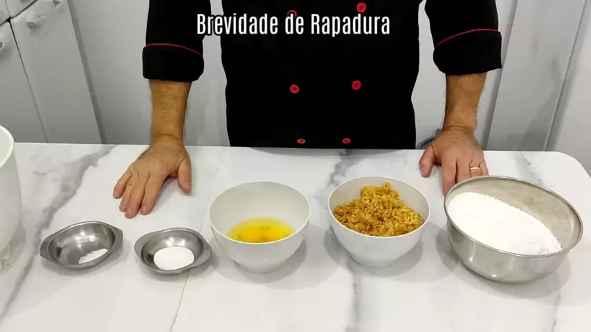 Brevida de Rapadura: 500 Gr Polvilho Doce, 350 Gr Rapadura, 3 Ovos, 2 colher chá bicarbonato, pitada sal