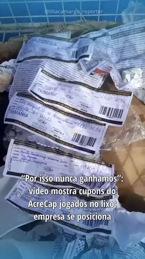 Um vídeo publicado pela jornalista Lília Camargo vem ganhando repercussão. As imagens mostram cupons do AcreCap, título de capitalização vendido no estado, encontrados descartados em uma lixeira, no Segundo Distrito da capital acreana. “É por isso que a gente não ganha, compra compra e nunca ganha. Aqui no Triângulo, achei uma caixa na lixeira cheia dos papeis (de cupom), não vão nem pro sorteio, jogam tudo no lixo”, diz a mulher em vídeo registrando o achado. 📲: Veja matéria completa em www...
