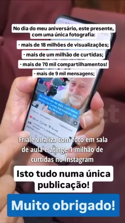 No dia em que comemora seu aniversário, neste domingo (20), o meteorologista e comentarista político Davi Friale celebrou o alcance de mais de 1 milhão de curtidas em uma única foto publicada no . Em um vídeo publicado na rede social, ele explica que o registro foi feito durante o intervalo de uma aula no Curso Aprovação, em Rio Branco. Sorridente e cercado por seus alunos, a fotografia do também conhecido como “O Mago do Tempo”, que parecia ser apenas um clique casual, ganhou proporç...