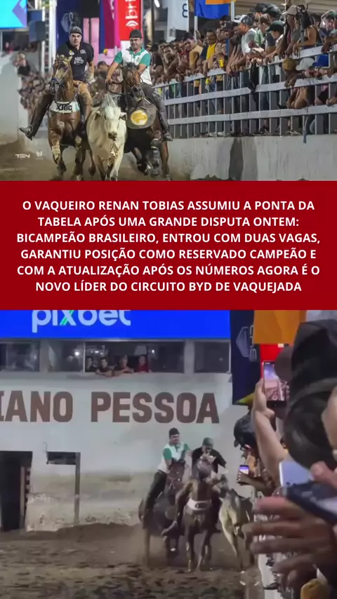 O vaqueiro Renan Tobias assumiu a ponta da tabela após uma grande disputa ontem; bicampeão brasileiro, entrou com duas vagas, garantiu posição como reservado campeão e, com a atualização dos números, agora é o novo líder do Circuito BYD de Vaquejada. #vaquejada #vaqueiro #competição