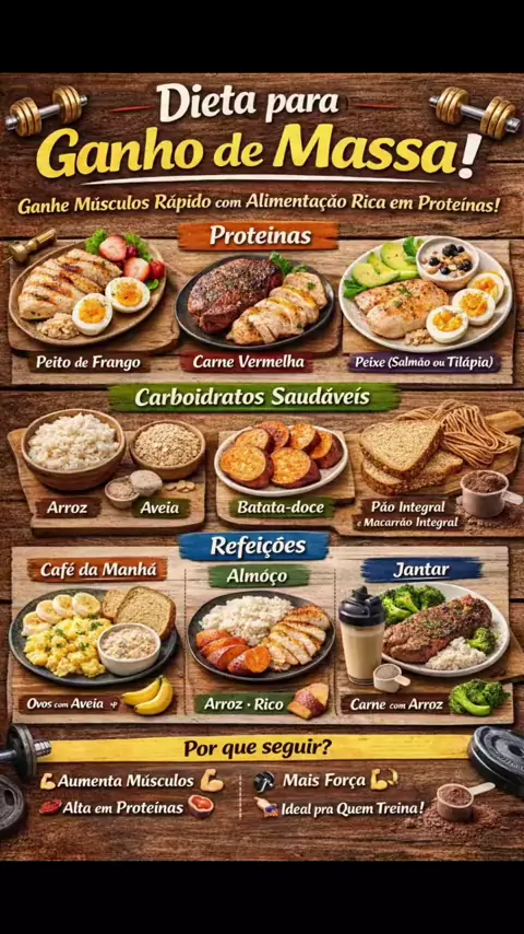 💪🔥 Quer ganhar massa muscular mais rápido? Essa dieta para ganho de massa é perfeita pra quem treina e quer ver resultado de verdade! 🍗🍚 Mais proteína, energia na medida certa e músculos crescendo 💥 👉 Salva esse post 👉 Curte ❤️ 👉 Comenta “QUERO” que eu mando mais dicas #GanhoDeMassa #ProjetoShape #DietaParaHipertrofia #VidaFitness #Academia