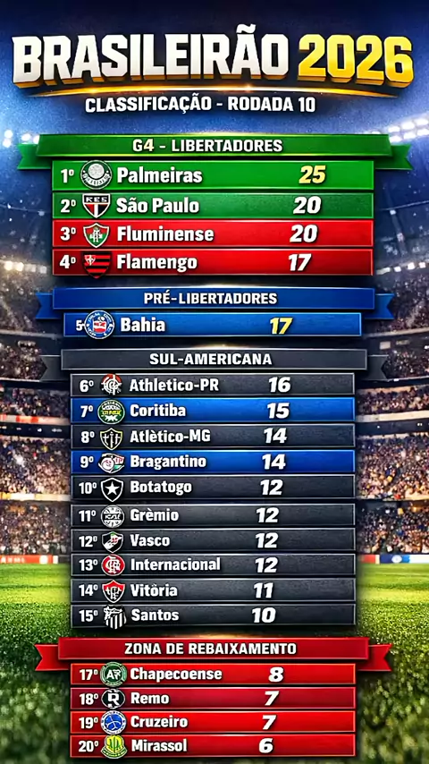 Classificação do Brasileirão 2026 após Final da 10° Rodada #brasileirao #clasificacao #futebolbrasileiro