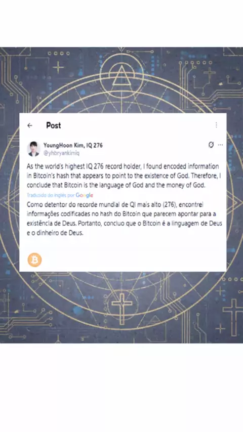 O Gênio que “Achou Deus” no Hash do Bitcoin.   YoungHoon Kim, que afirma ter o maior QI do mundo (QI 276), disse que encontrou “informações divinas” dentro dos hashes do Bitcoin. Segundo ele, isso provaria que o Bitcoin é a linguagem de Deus. #younghoonkim #QI276 #maiorQIdomundo  #bitcoin #deusbitcoin