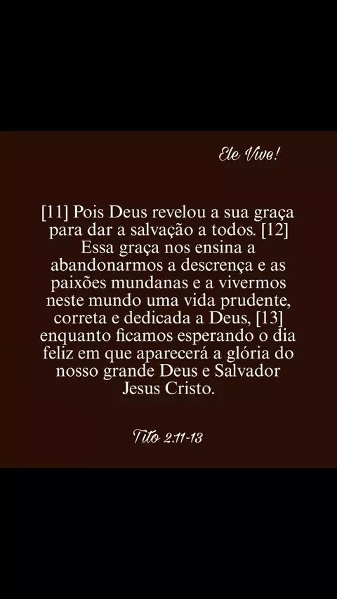 Tito 2:11-13  [11] Pois Deus revelou a sua graça para dar a salvação a todos. [12] Essa graça nos ensina a abandonarmos a descrença e as paixões mundanas e a vivermos neste mundo uma vida prudente, correta e dedicada a Deus, [13] enquanto ficamos esperando o dia feliz em que aparecerá a glória do nosso grande Deus e Salvador Jesus Cristo. #jesuscristo #oraçãododia #versiculo #versiculos #PalavraDoDia