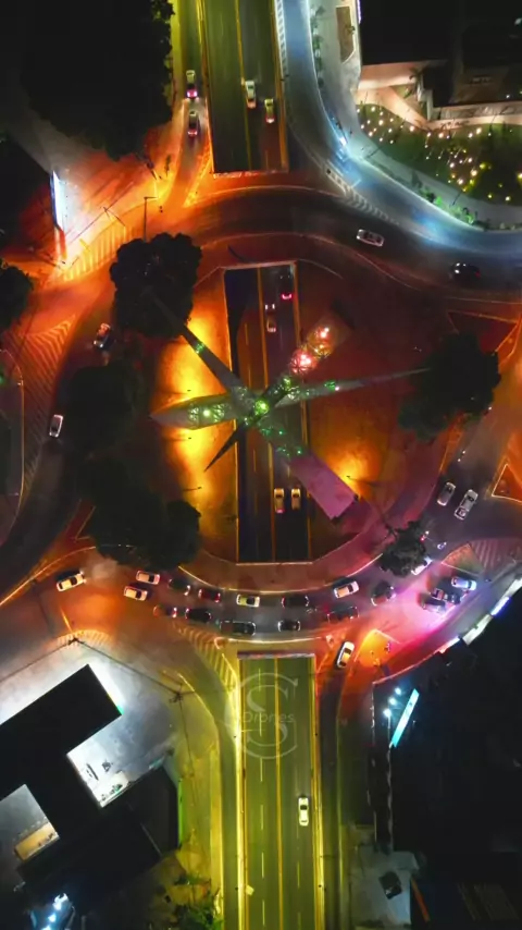 Viaduto Latif Sebba, em Goiânia-Go: três prismas de 56m, com estrutura tubular de aço revestida por chapas metálicas perfuradas, apontando para diferentes direções, compõem o Monumento da Praça Latif Sebba, popularmente conhecido como Praça do Ratinho. Suas pontas estão direcionadas para Leste, Oeste e Sul, as direções nas quais cresceu (e cresce) Goiânia. Fonte: Bora pra Goiás. Vídeo gravado em 27/09/2024. #goiania #viadutolatifsebba #drone #dji