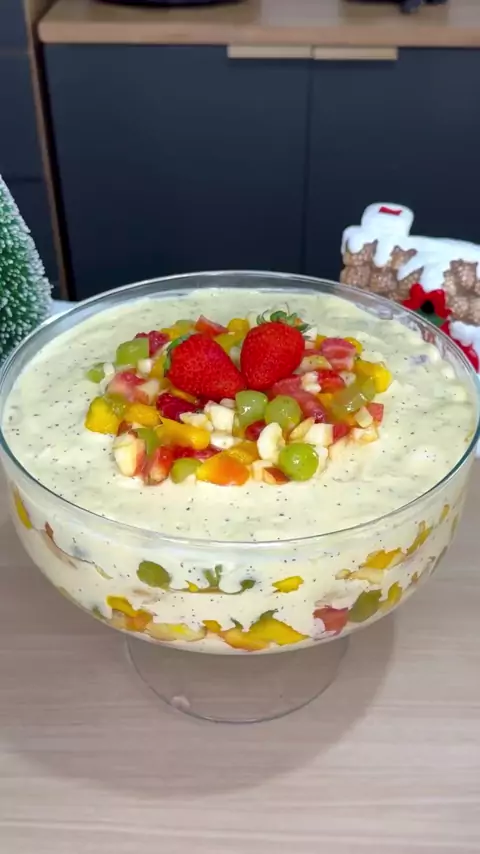 Pavê de salada de frutas perfeito pro natal e ano novo Ingredientes: - 1/2 envelope de gelatina de maracujá - 100ml de água quente - 2 caixinhas de creme de leite - 2 caixinhas de leite condensado - 250ml de suco de maracujá concentrado - 400g de uvas sem semente - 2 mangas médias - 1 mamão pequeno - 1 bandeja de morango - 2 maçãs - 4 bananas prata - 300g de biscoito champanhe - Um pouco de frutas para decorar - 2 morangos para decorar #pavê #saladadefrutas #Natal #anonovo