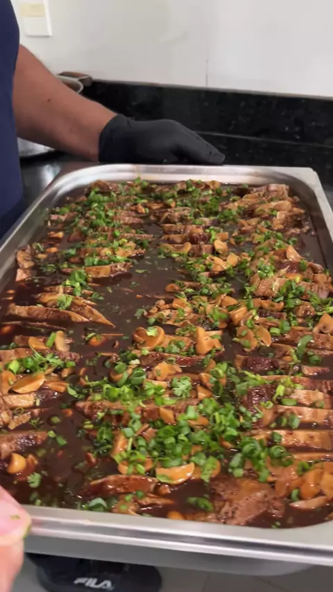 RECEITA DE LAGARTO AO MOLHO MADEIRA PARA SERVIR 40 PESSOAS Ingredientes 1 fio de óleo 250ml 300g de alho amassados 4 cebolas ralada 10kg de lagarto Sal a gosto Pimenta do reino Páprica doce a gosto Tempero baiano a gosto Chimichurrui Água para o cozimento do lagarto 500ml de shoyo para o cozimento 500g de cogumelos Cheiro verde picado Molho madeira Molho do cozimento 500ml de molho shoyo 800ml de vinho tinto seco Folha de louro 3 colheres de sopa de farinha de trigo diluído em 2