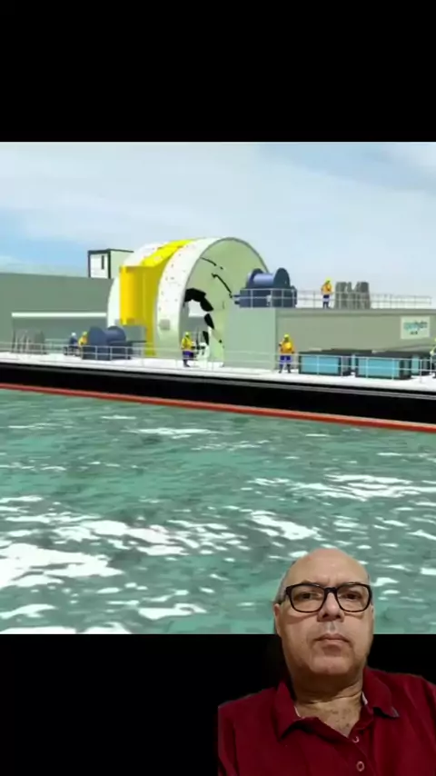 Uma turbina gigante submersa em fortes correntes gera energia limpa e sustentável sem prejudicar a vida marinha. O centro aberto protege os peixes, enquanto a eletricidade é enviada para terra por cabos submarinos. Um catamarã especializado transporta e posiciona a turbina com eficiência. #EnergiaRenovável #Sustentabilidade #EnergiaLimpa #InovaçãoTecnológica #PreservaçãoMarinha