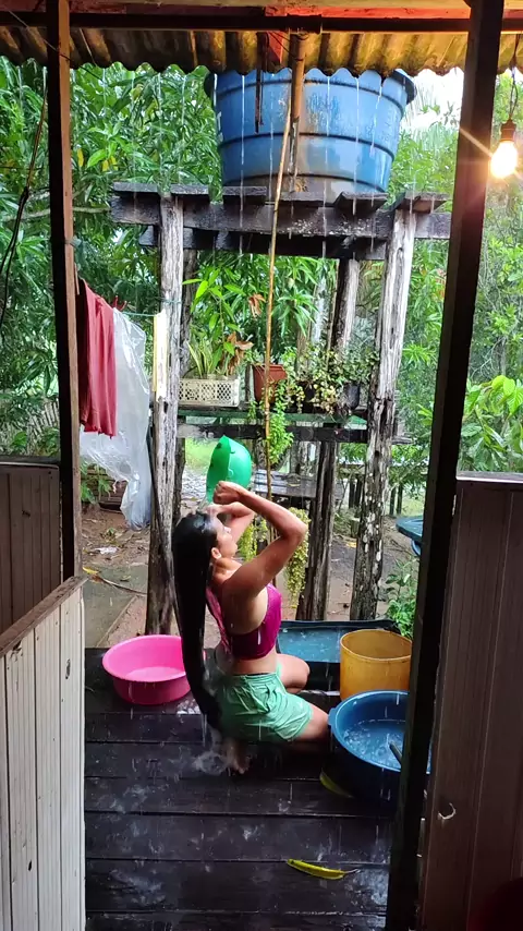 cabeluda lavando o seu cabelo debaixo de chuva #vivaavidasejafeliz # #