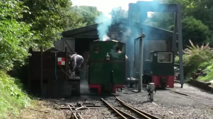 Um trem a vapor sendo reabastecido com carvão em Lynton & Barnstaple Railway, Devon, UK. 🚂