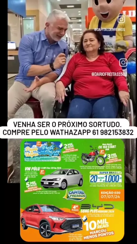 COMPRE PELO WHATSAPP 61 982153832 Olá, Capitalzeiro! 🎉 Chegou a sua vez! 🌟 No dia 07/07, concorra a prêmios incríveis que podem mudar a sua vida! 🚀💰 Como garantir essa chance? Fácil! Compre e acredite no Capital de Prêmios! 🍀✨ Compre agora o seu pelo link da nossa BIO ou visite o Ponto Pé Quente mais próximo! 🔥 O Capital de Prêmios: onde sonhar nunca custou tão pouco! 🍀🍀🍀 #ParticipeAgora #CapitalDePrêmios #Brasília #DistritoFederal #Reels