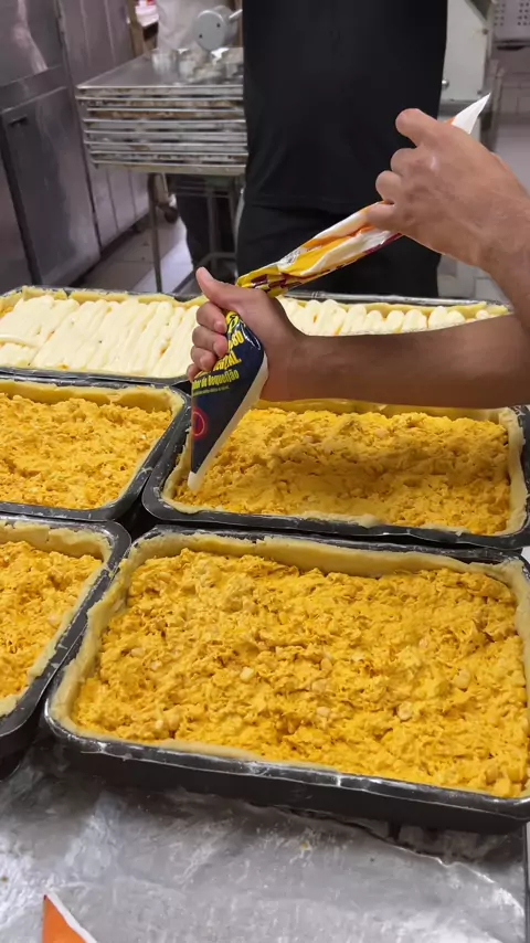 Massa do pão tigre 2000 g farinha de trigo 35 g melhorador 35 g sal 2 ovos 50 g margarina 70 g fermento fresco 1000 ml água gelada 50 g leite em pó 250 g açúcar COBERTURA craquelado 10 gemas 100 ml de óleo de soja 40 g amido de milho #Comida #food #massas #padaria