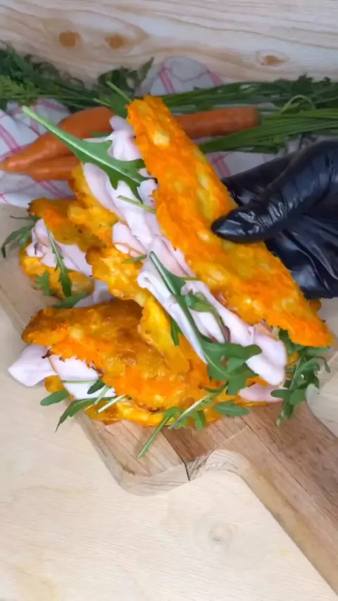 Ingredientes: 3 cenouras grandes (ou 4 médias) 1 ovo 70g de queijo ralado (usamos mussarela) Recheio: Temos rúcula e peito de peru Preparo: Lave as cenouras e retire as pontas de cada uma. Com a ajuda de um descascador de batatas, retire a parte exterior e depois rale-as com um ralador de orifícios estreitos (também pode triturá-las). A esta altura basta juntar todos os ingredientes e misturar até a massa ficar amalgamada! Tudo o que você precisa fazer é moldar suas tortilhas!